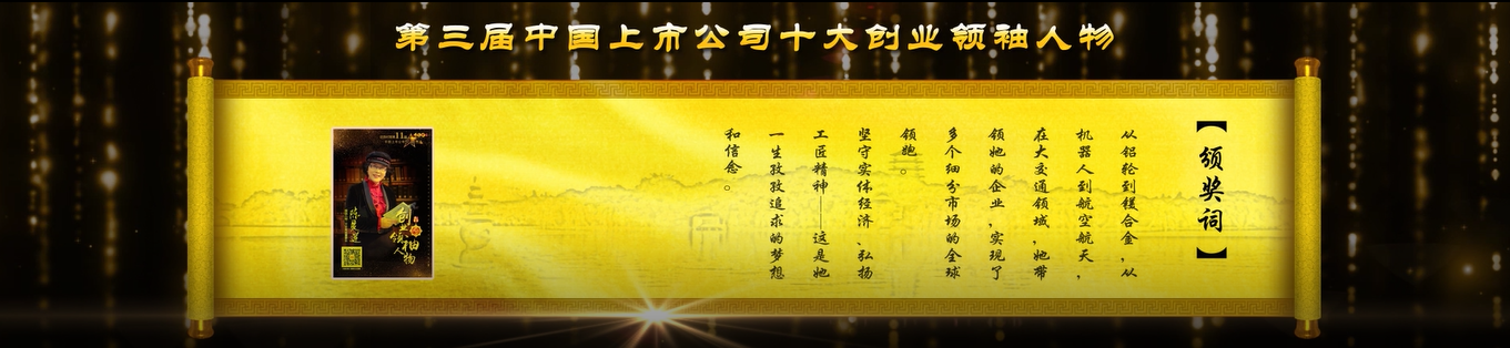 “從鋁輪到鎂合金,從機器人到@航空航天,在大交通領域,她帶領她的企業,實現@了多個細分市場的全球領跑。堅!守實體經濟,弘揚工匠精神—!—這是她孜孜追求的夢想和信念。”