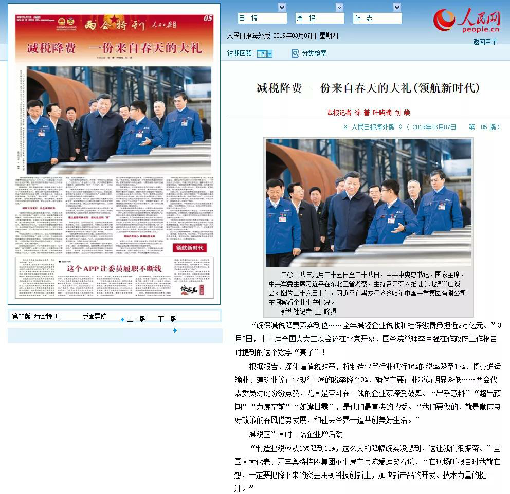 針對報告中提出的“減稅降費”等措施,《人民日報》兩會特刊報道了“減稅降費 ,一份來自春天的大禮”專題文章,全國人大代表、萬?豐集團董事局主席李藝連與各代表委員}們一起暢談“領航新時代”,并在《,人民日報》影像志中留下了履職風采&。